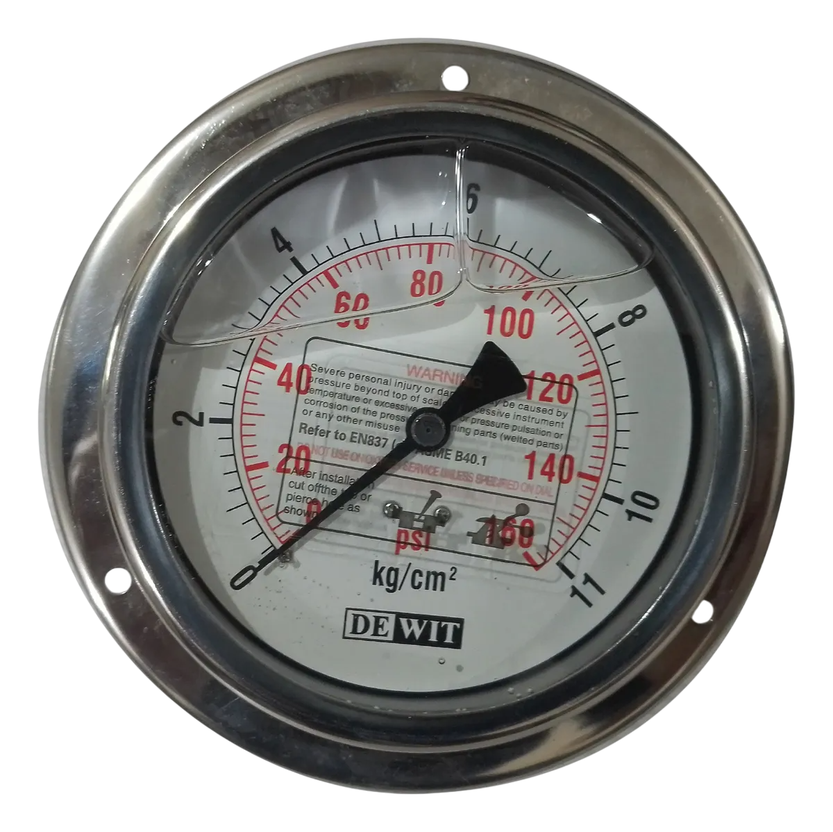 Manómetro con glicerina y caja de acero inoxidable, ideal para entornos con agentes corrosivos, polvo, vibración o pulsaciones fuertes. Perfecto para medir presión en sistemas con fluidos corrosivos que no dañen el bronce, como bombas y plantas industriales.
