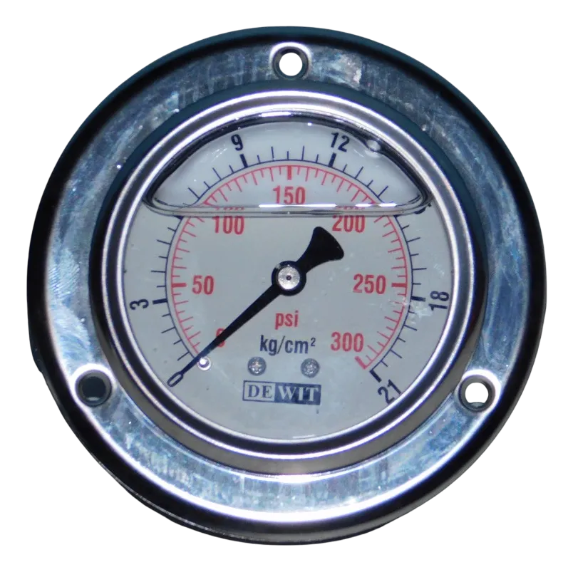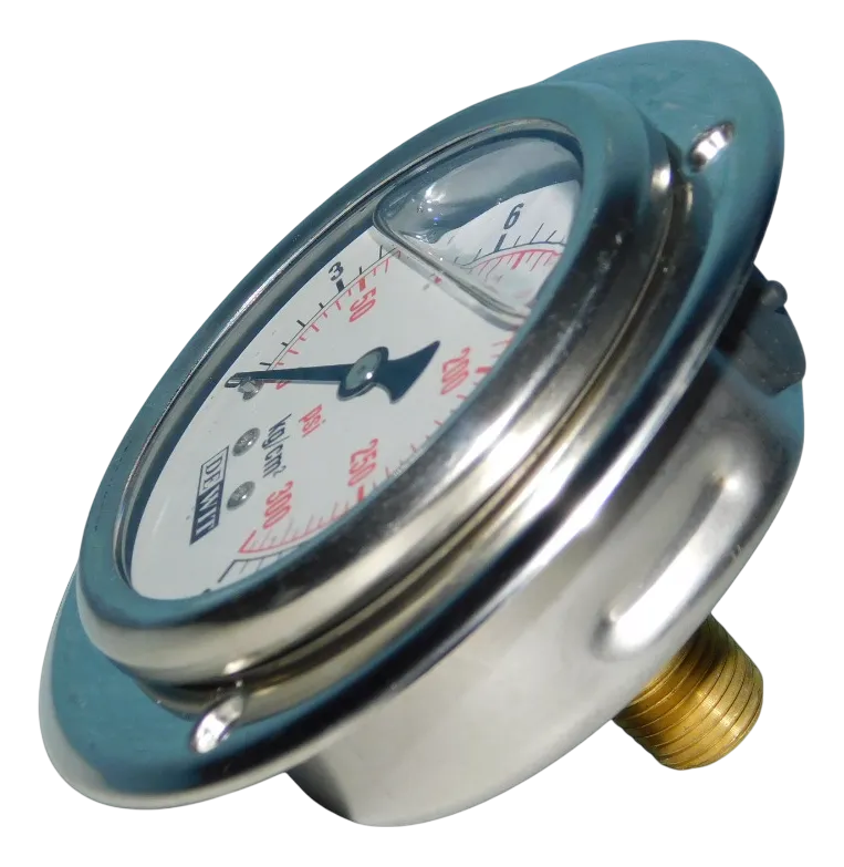 Manómetro con glicerina y caja de acero inoxidable, ideal para entornos con agentes corrosivos, polvo, vibración o pulsaciones fuertes. Perfecto para medir presión en sistemas con fluidos corrosivos que no dañen el bronce, como bombas y plantas industriales.