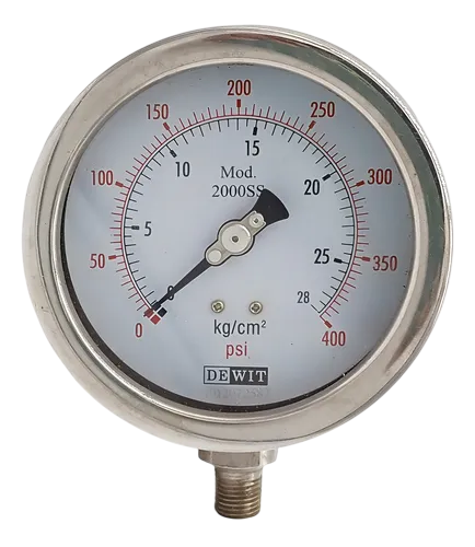 El manómetro DE WIT con caja de acero inoxidable está diseñado para ambientes agresivos en industrias químicas y petroleras. Su sellado hermético permite llenado con fluidos amortiguantes para uso en áreas con alta vibración. Es fácil de desmontar para mantenimiento y recalibración en campo.